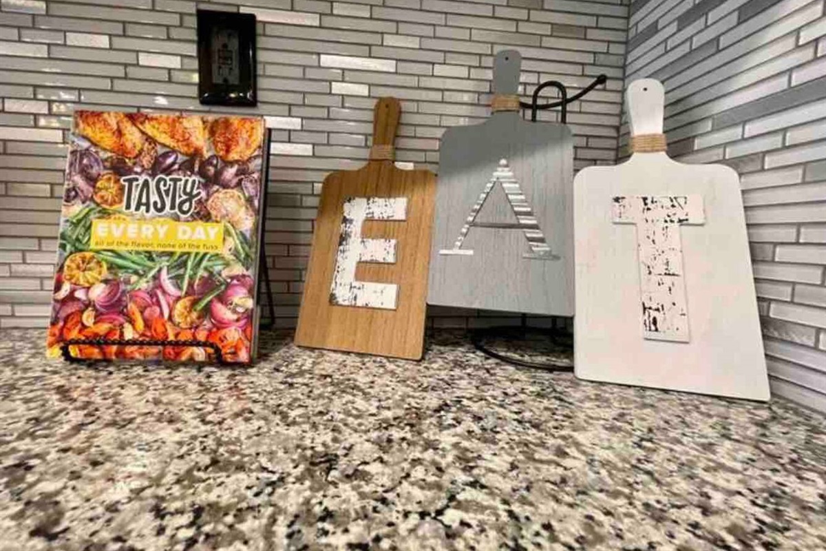 -Cooking utensils: knife set, cutting boards, measuring cups & spoons, pots & pans, can opener, spatulas, BBQ utensils, and other cooking utensils.
